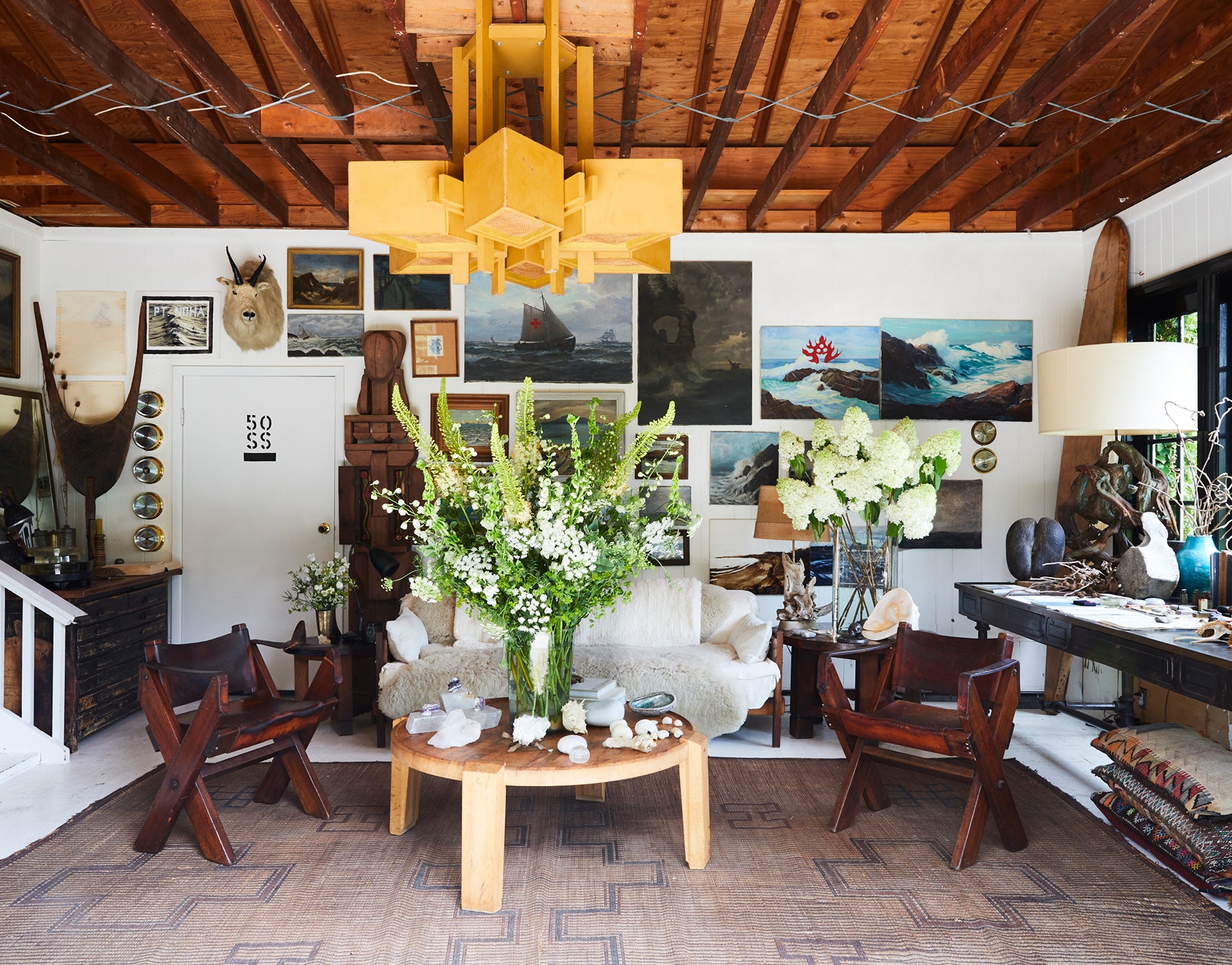 indulgent luxury with laidback ease: a Danish buffalo leather sofa for post-surf naps, a
